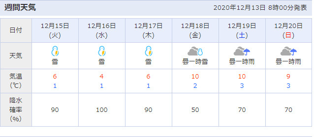 月曜日の夜くらいから降り始めて木、金曜日まで雪ですか…!(何かをあきらめた表情