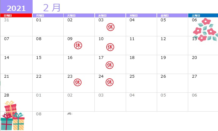 さて2月の定休日のお知らせです