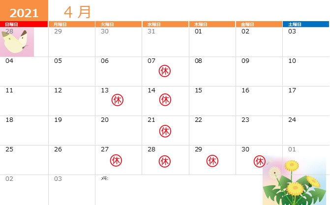 さて本日は更新が遅れておりました4月の定休日のお知らせです