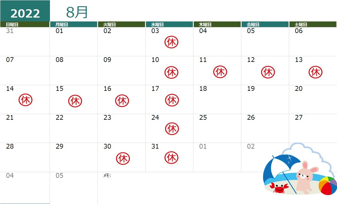 8月の定休日のお知らせ