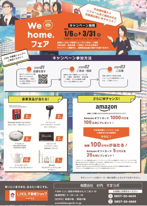 We homeフェアを1月6日(月)~3月31日(月)の期間開催いたします。来店、ご相談(物件見学・査定依頼・ご契約)されましたお客様がキャンペーン期間中に、豪華賞品抽選に無料で応募できます。この機会に不動産についてご相談してみませんか…。是非お待ちしております!!