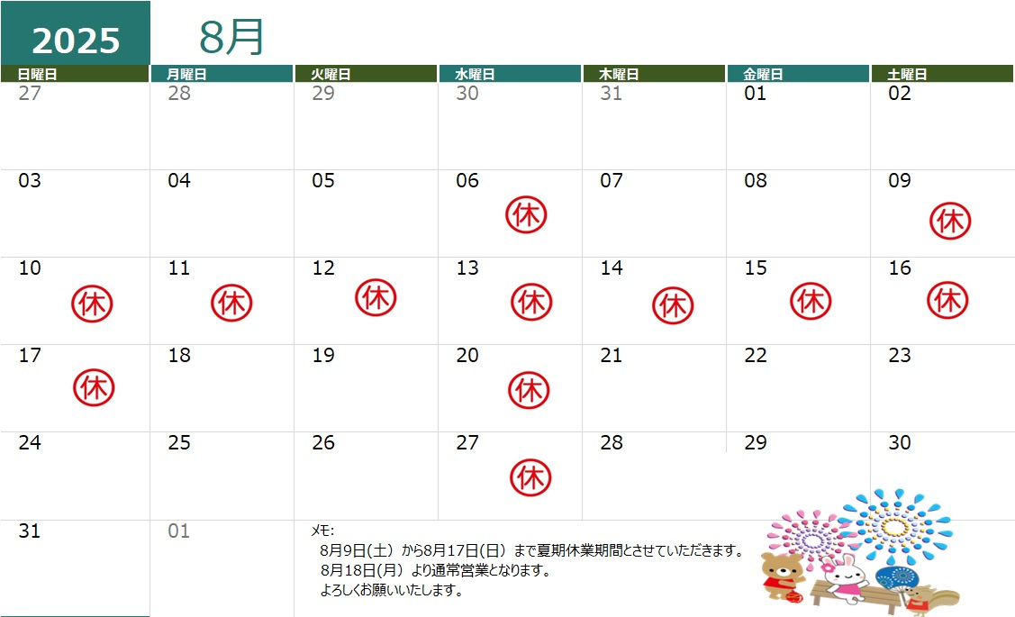 ~8月の定休日のお知らせ~