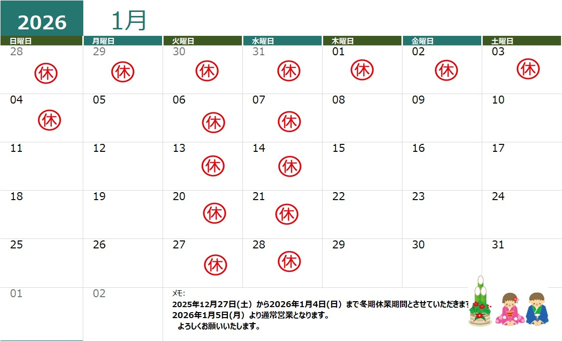 | 2025-12-22 | ~1月の定休日のお知らせ~ 今年も大変お世話になりましてありがとうございました。お陰様で、無事に一年を終えることができそうです。来年もより一層皆様のお力になれるよう、従業員一同精進して参りますので、すまラボをよろしくお願いいたします。何かお困り事などがあれば、お気軽にお声掛けしていただけますと幸いです。皆様が良い年をお迎えくださいますよう、心よりお祈り申し上げます。新年は5日(月)より通常営業いたします。 ![]() |