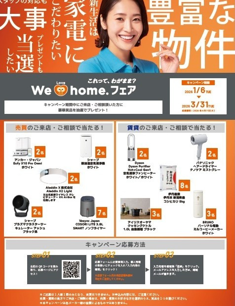 | 2025-09-02 | ~秋のキャンペーンのお知らせ~ LIXIL不動産ショップの秋のキャンペーンが9月1日~11月10日までの期間開催されます。対象となるのは、キャンペーン期間中にご来店・ご相談(物件見学・見積依頼・ご契約)されたお客様になります。ぜひ期間中にすまラボに来店して豪華賞品に応募しませんか。お待ちしております!! ![]() |